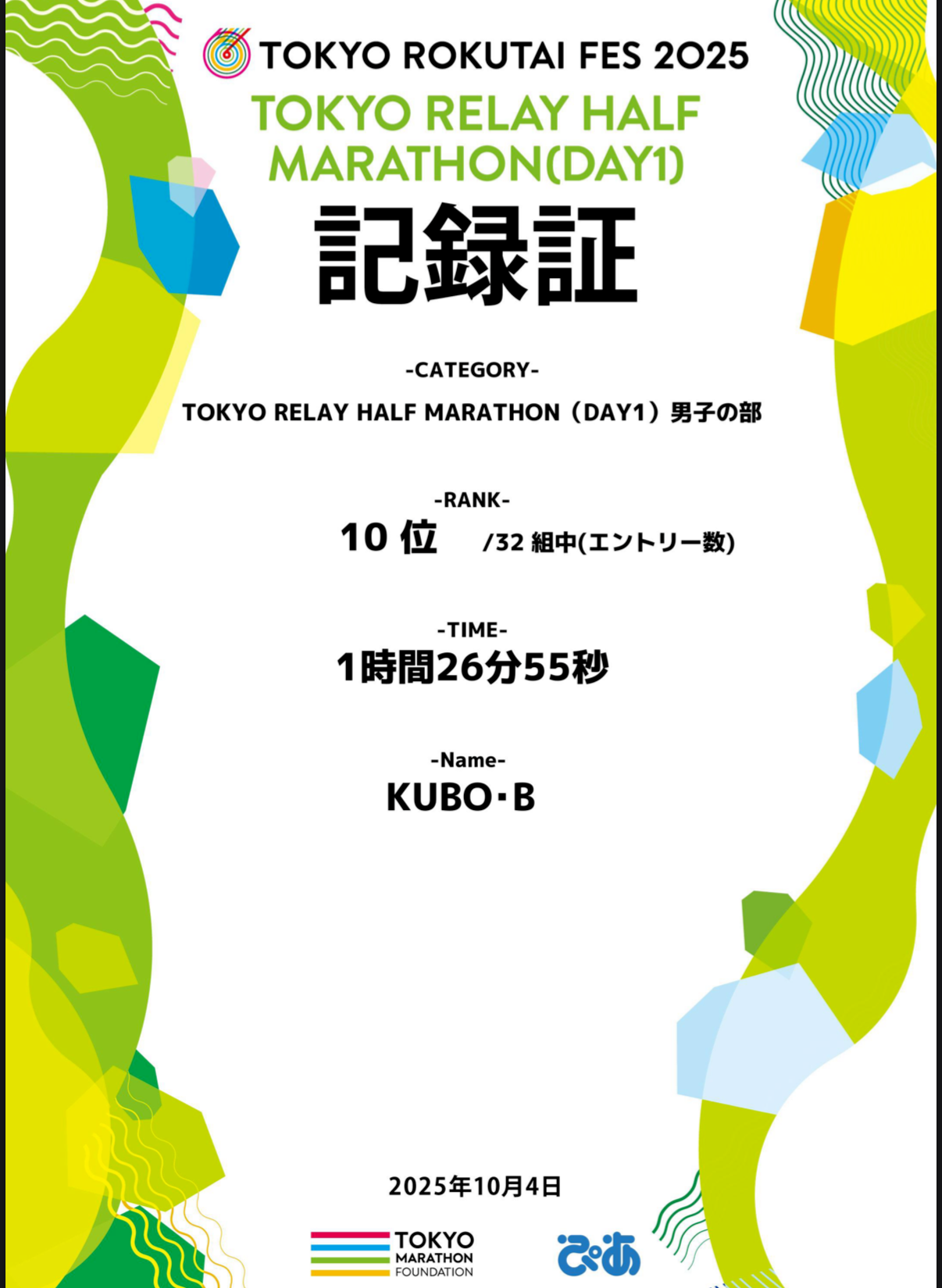 2025.10.4 味の素スタジアムにてTOKYO ROKUTAIに参加しハーフリレーを完走しました。 |